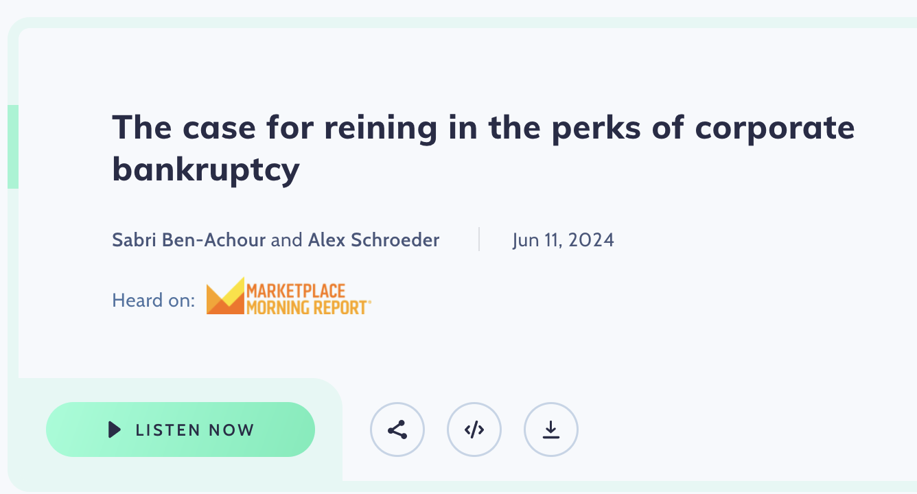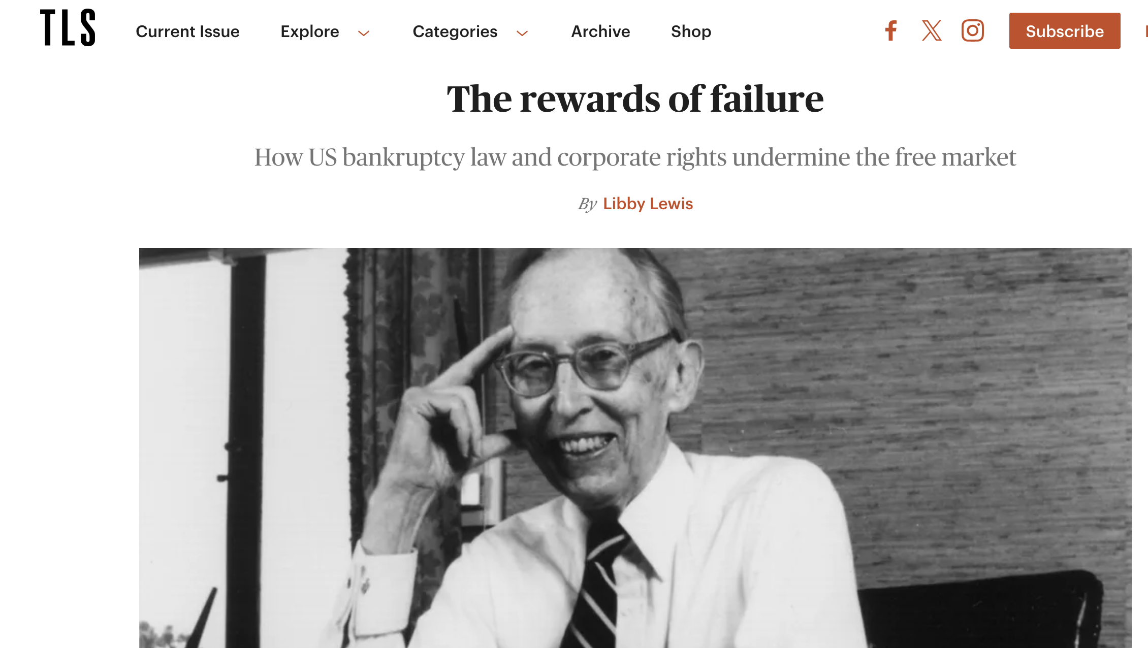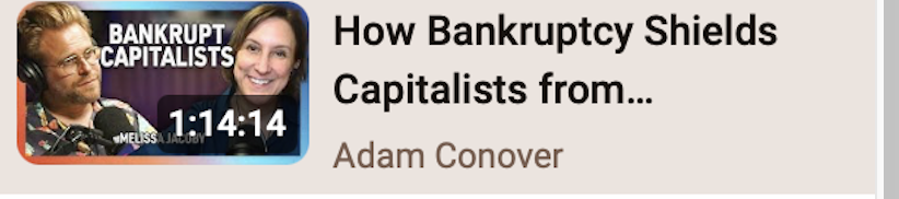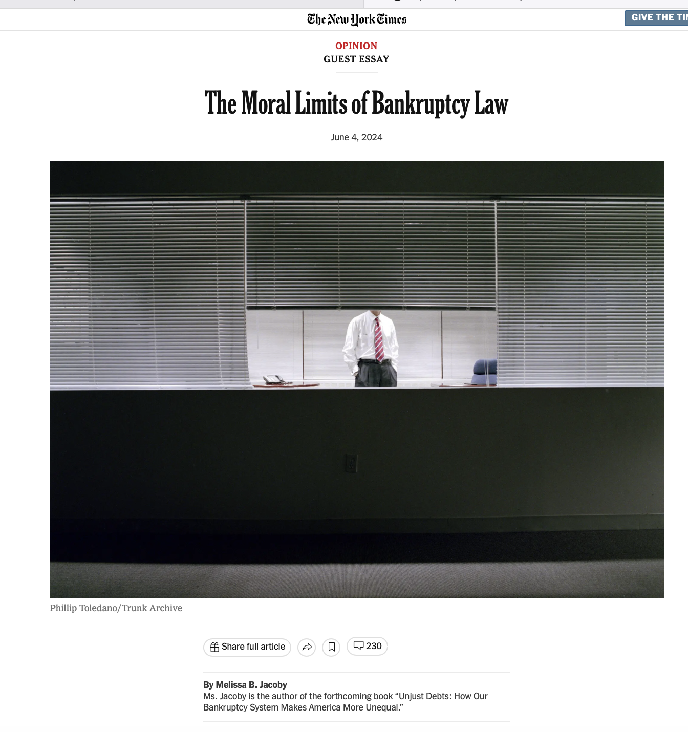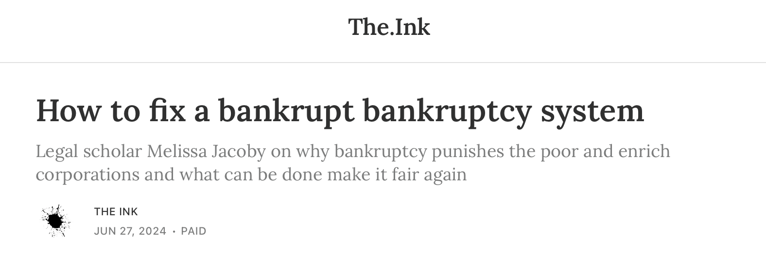 “Melissa Jacoby, a law professor whose forthcoming book Unjust Debts: How Our Bankruptcy System Makes America More Unequal synthesizes three decades of research into the system's frustrating contradictions, helpfully summarizes the crux of the issue as bankruptcy’s “structural bias in favor of artificial persons”—i.e., corporations, nonprofits, and constructed entities explicitly designed to shield rich and powerful owners from the consequences of their misdeeds.”