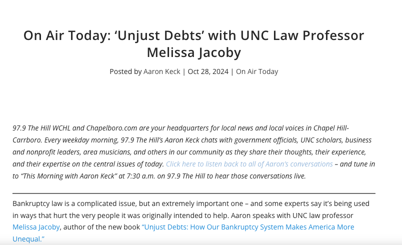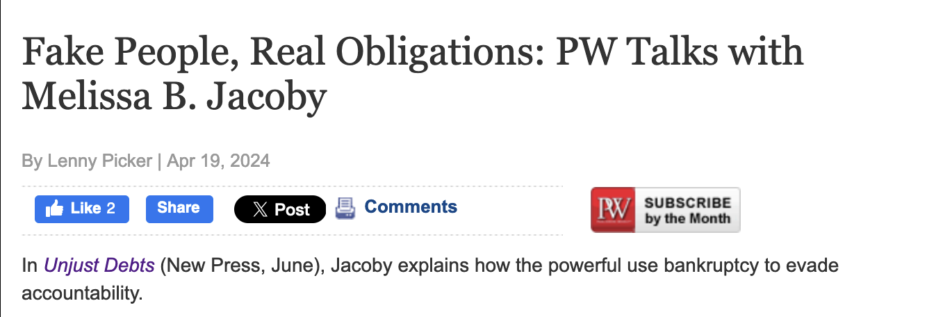 “Bankruptcy – which touches millions of Americans – is supposed to be society’s safety valve for hard times. Instead, Unjust Debts exposes how our unjust system simply exacerbates the problems it was created to fix. With wit and wisdom, Melissa Jacoby offers a master class in this vitally-important and deeply-flawed corner of our legal system.”